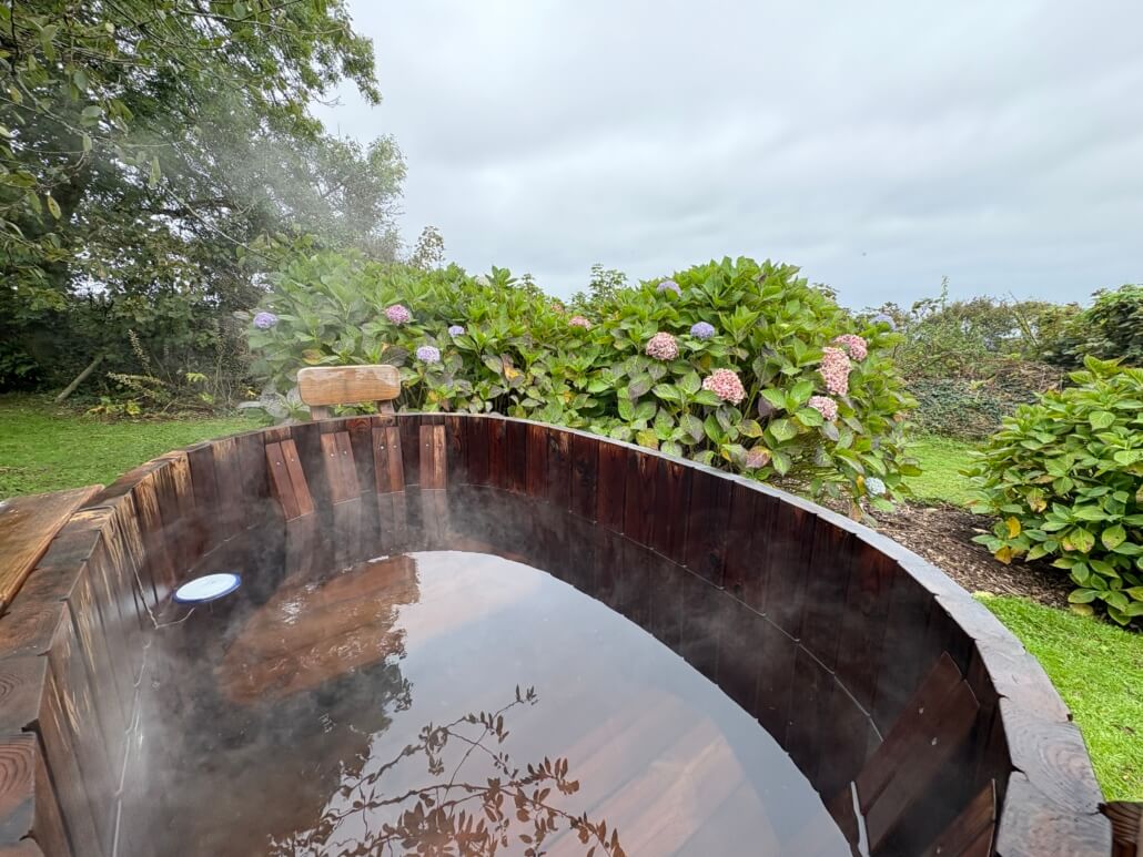 Encircled by lush fruit trees, vibrant hydrangeas, and towering palm trees, two Japanese-style “ofuro” wooden baths offer a truly enchanting escape. Imagine immersing yourself in the soothing sounds of nature—the chirping birds, the crackling fire, and the gentle rustling of leaves. And if you’re feeling particularly lucky, the sizzling raindrops on the chimney can add to the magical ambiance. These heated baths reach a delightful temperature of 42 degrees Celsius, making them one of our personal favourites for enjoying the outdoors on a gloomy day.