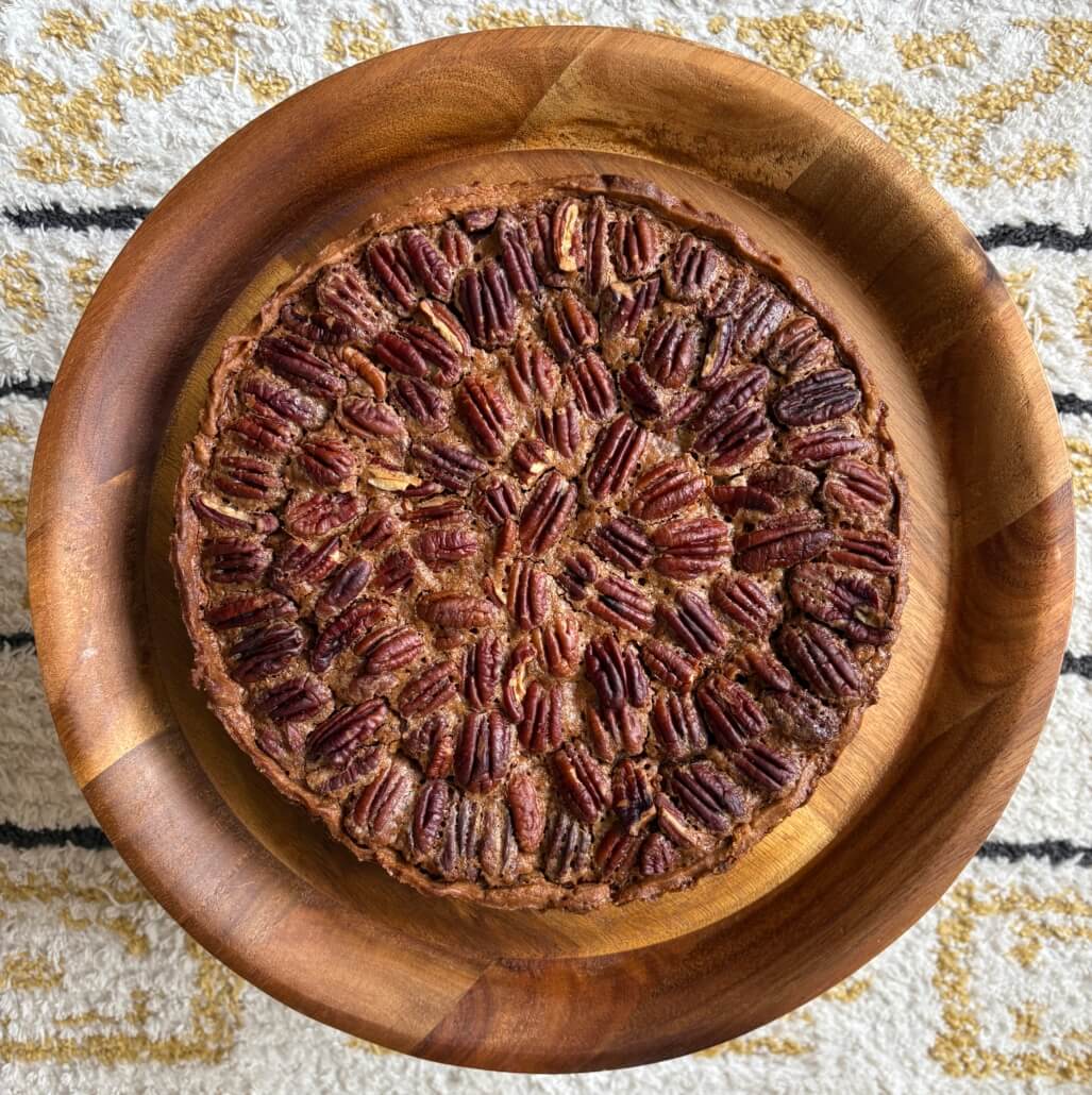 A pecan pie with a decorative pattern of whole pecans on top, placed in a round wooden bowl on a textured, patterned surface. Sancreed House Retreat