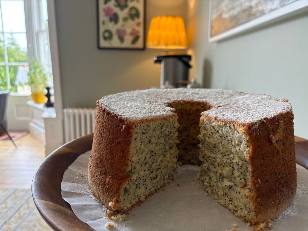 A poppy seed cake with a missing slice sits on a wooden plate in a cozy, softly lit room with a window, a lamp, and artwork on the wall in the background. Sancreed House Retreat